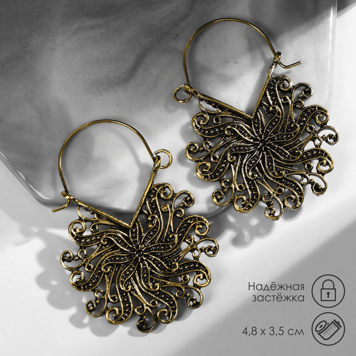 Серьги металл «Восток» цветы, течение, цвет чернёное золото