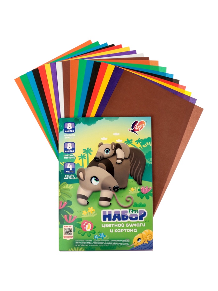Набор цветной бумаги и картона Zoo. «Муравьед», А4, 20 листов (8 листов бумаги, 8 листов картона, 4 листа белого картона)