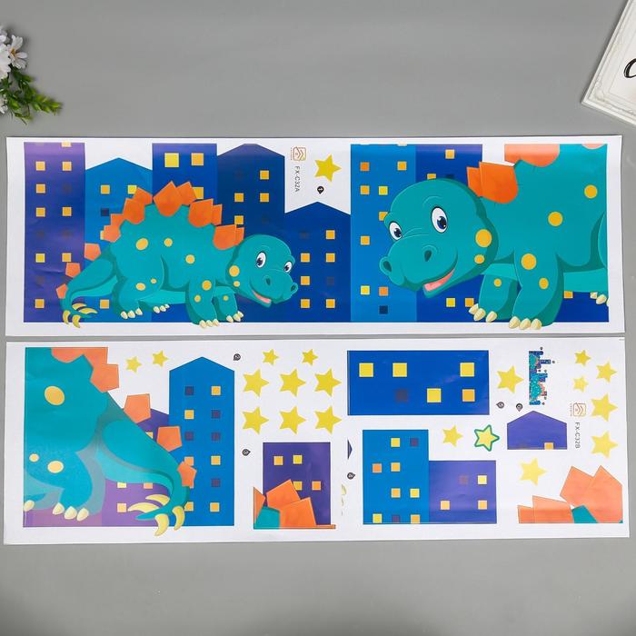 Наклейка пластик интерьерная цветная "Динозаврики в городе" набор 2 листа 30х90 см