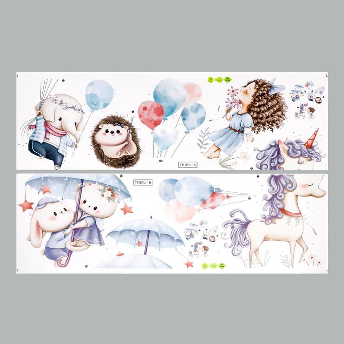 Наклейка пластик интерьерная цветная "Зверята с шариками, зонтиками" 30х90 см набор 2 листа