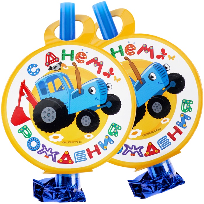 Карнавальные язычки гудки "Синий трактор" С Днем Рождения! "11 см, 6 шт.