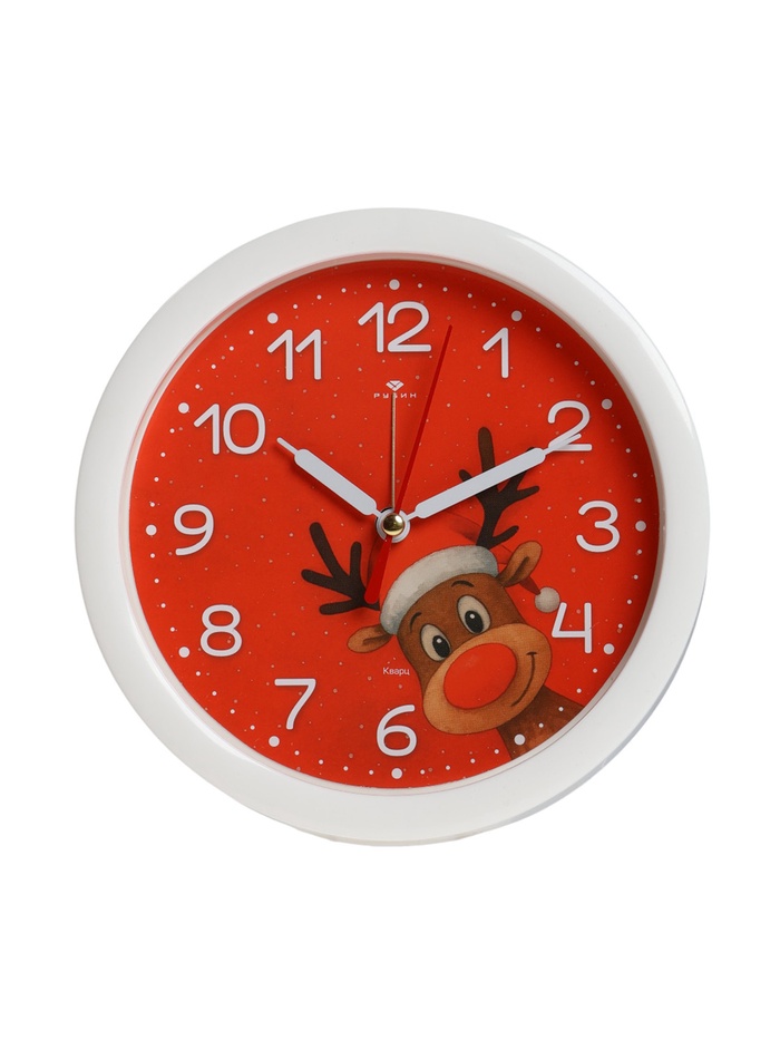 Будильник «Новогодний олень», плавный ход, d=15 см, красный, корпус белый