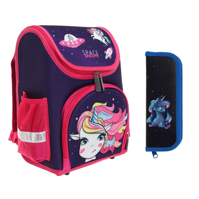 Рюкзак школ. с Эргон. спин. 28*18*36 см, +Пенал, девочка, Единорог, черн/роз