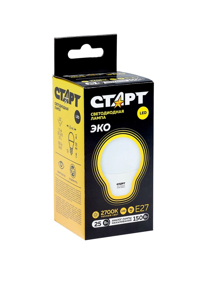 Лампа светодиодная СТАРТ, 25 Вт, Е27, А60, 2700К, 2000 Лм, свечение тёплое белое