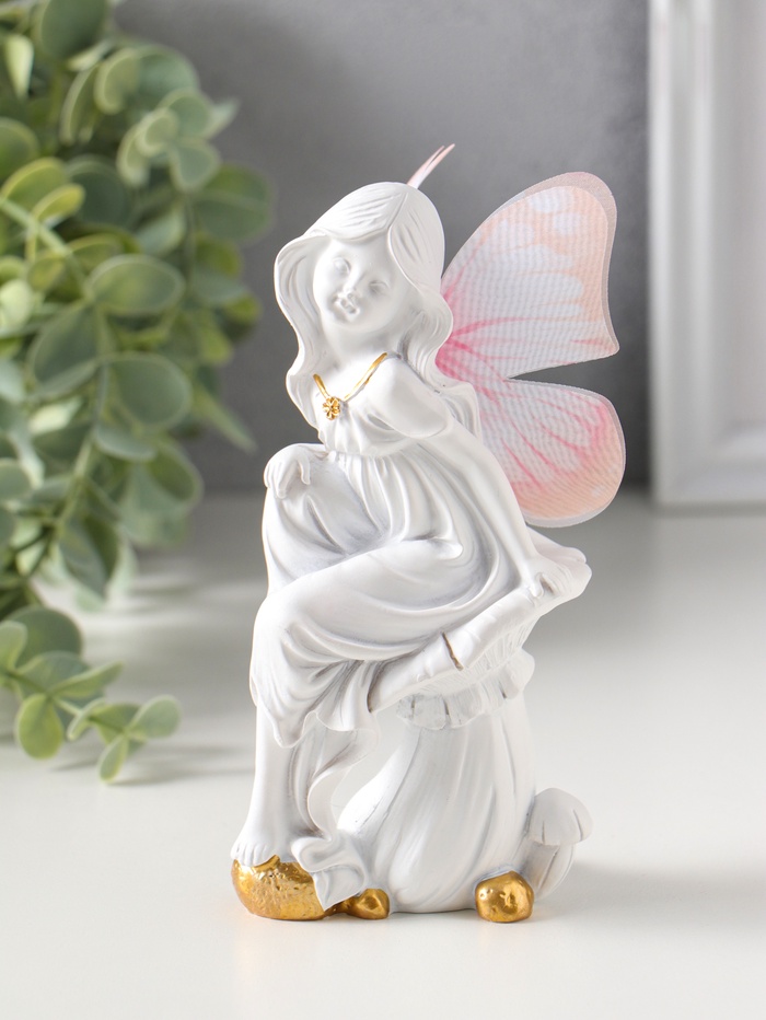 Сувенир полистоун "Девочка-бабочка на грибочке" белый 5,5х7х14,5 см