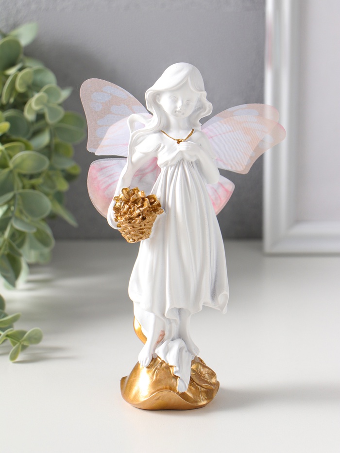 Сувенир полистоун "Девочка-бабочка с золотыми цветами в корзинке" белый 5х6,5х17,2 см
