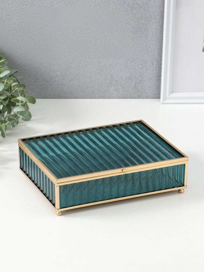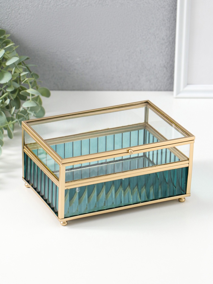 Шкатулка стекло с металлическим каркасом "Линии по низу" голубая 14х18х9,5 см