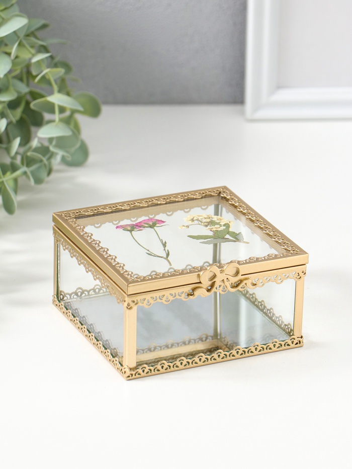 Шкатулка стекло с металлическим каркасом "Сухоцветы" квадрат 10х10,5х5,2 см