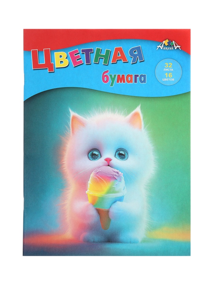 Бумага цветная А4 32л 8цв 50г/м² "Котёнок с мороженым", 1-стор, газет, скоба