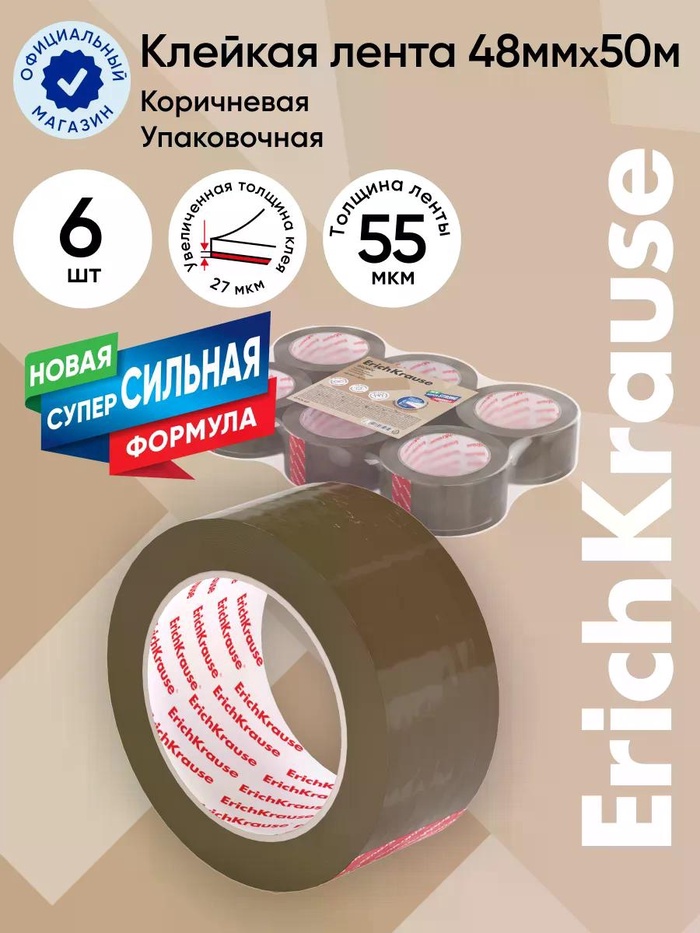 Клейкая лента упаковочная ErichKrause Brown, 48×50 мм, коричневая