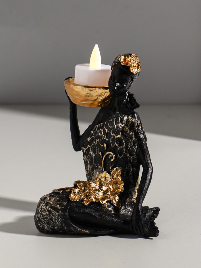 Фигурка-подсвечник на 1 свечу «Африканка в чёрном платье с цветами с золотом», полистоун, d=4.5 см, 11×13×16 см