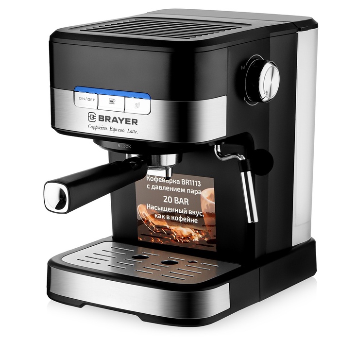 Кофеварка BRAYER 1113BR, рожковая,1100 Вт, 20 бар, 1.5л, автоматич.капучинатор, черная