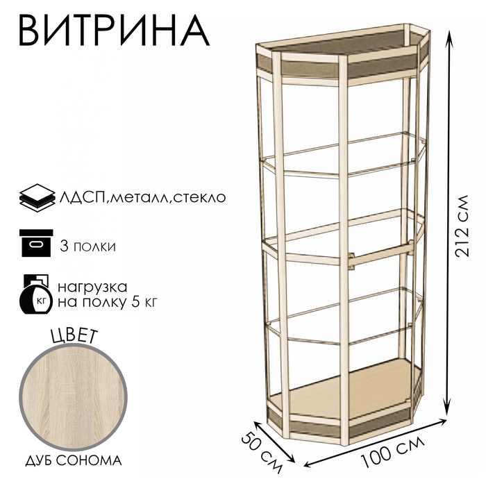 Витрина ТР1н, 1000×500×2000, ЛДСП, стекло, цвет дуб сонома