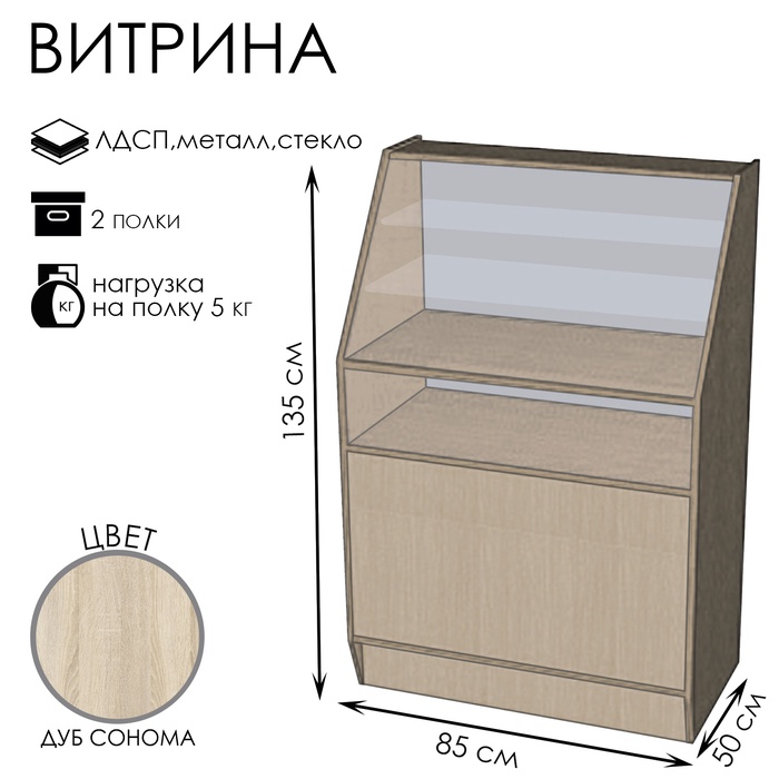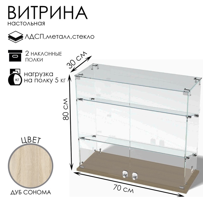 Витрина настольная, 2 наклонные полки, 800×300×700 мм, ЛДСП, стекло, цвет дуб сонома