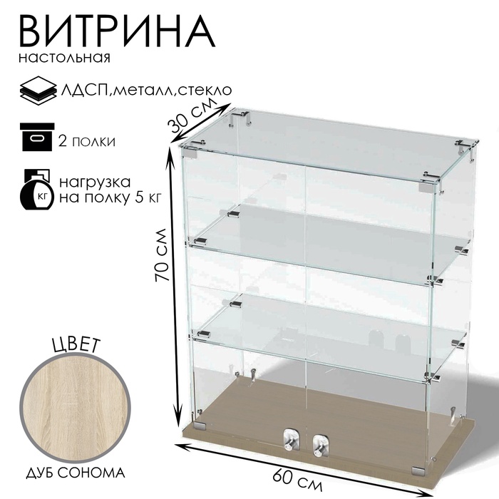 Витрина настольная, 2 полки, 600×300×700 мм, ЛДСП, стекло, цвет дуб сонома
