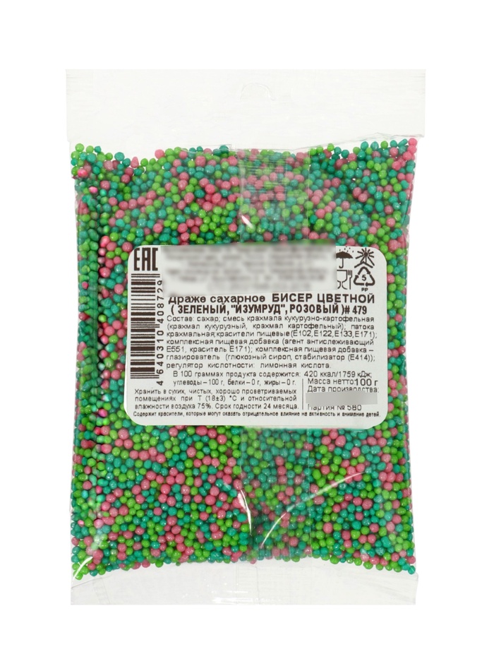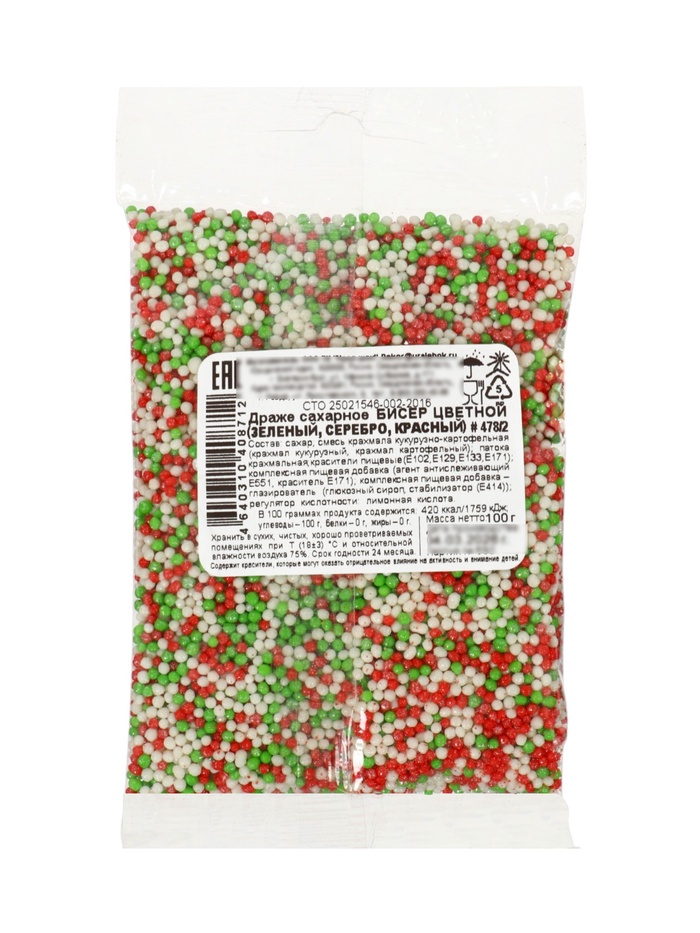 Драже сахарное бисер цветной (зеленый, серебро, красный) 100 г № 478/2
