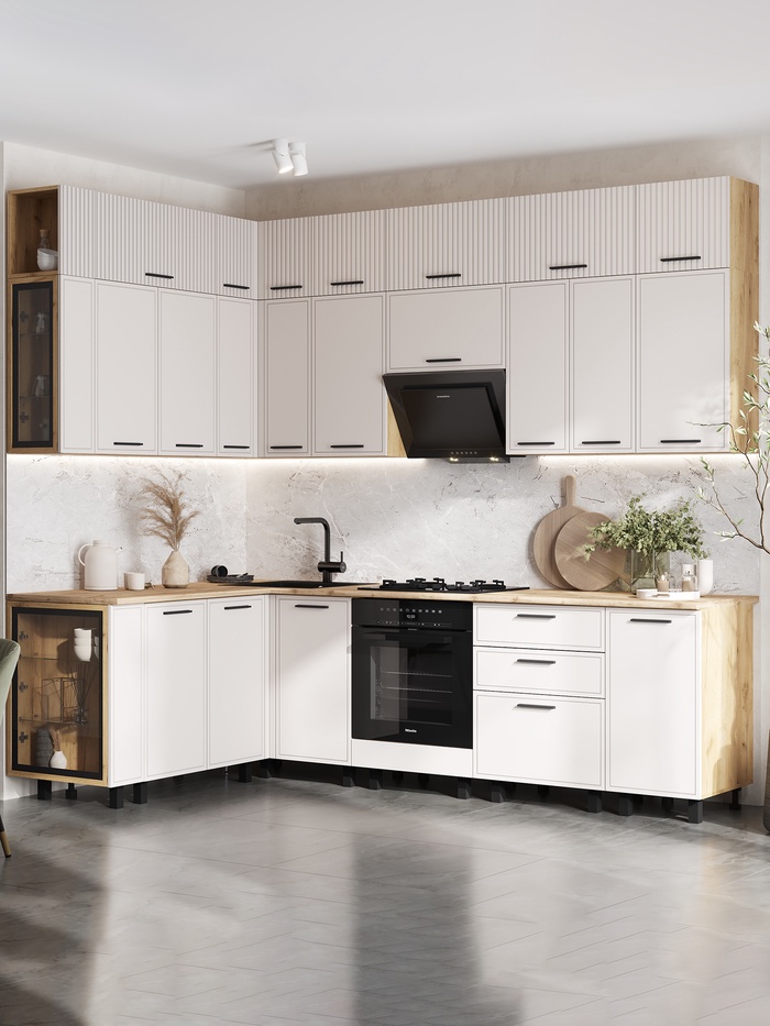 Кухонный гарнитур угловой в потолок «Бьянка», 1600×2600 мм, цвет кашемир МДФ/дуб крафт