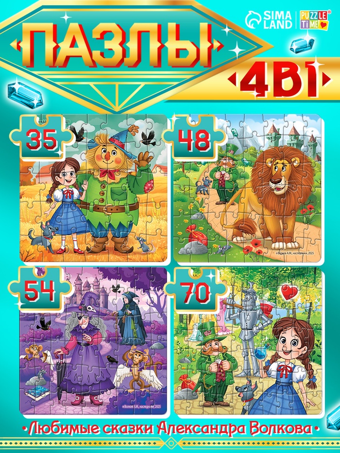 Пазлы 4 в 1 «Волшебник изумрудного города», 35, 48, 54, 70 деталей
