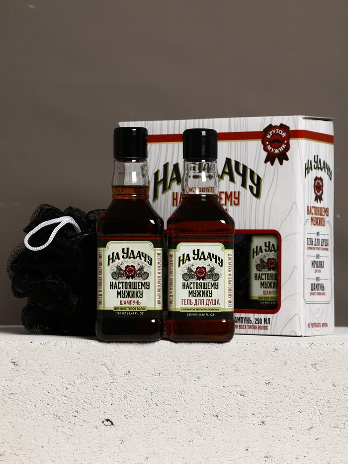 Подарочный набор «Крутой мужик», гель для душа во флаконе виски, шампунь и мочалка лента, Чистое счастье