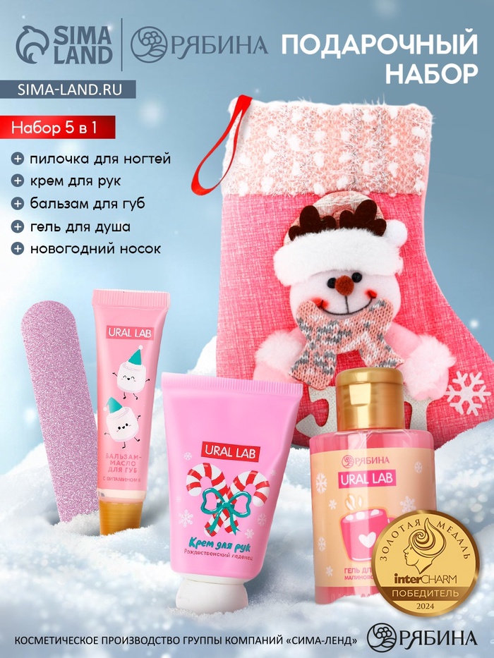 Подарочный набор в новогоднем носке: гель для душа, крем для рук, бальзам для губ и пилочка, URAL LAB