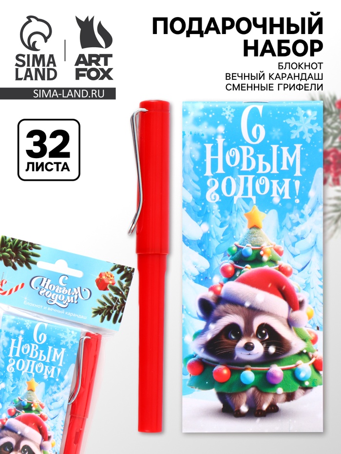 Подарочный набор новогодний «Енотик», блокнот, вечный карандаш, сменные грифели