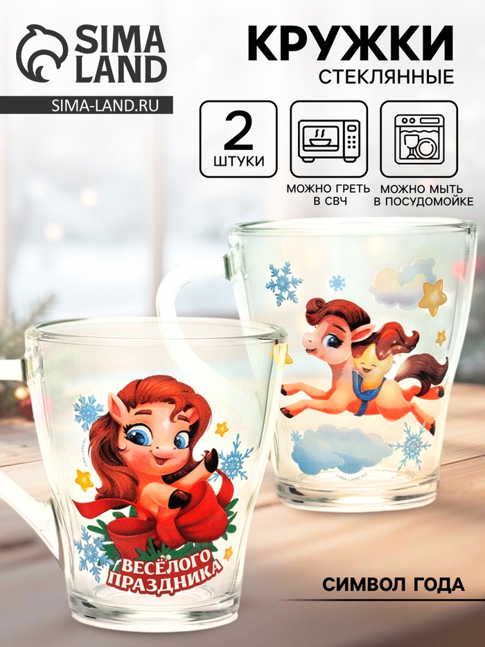 Кружки стеклянные новогодние «Весёлого праздника. Лошади», набор 2 шт.