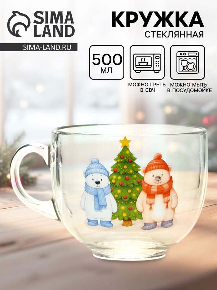 Кружка стеклянная новогодняя «Мишки в лесу», 500 мл