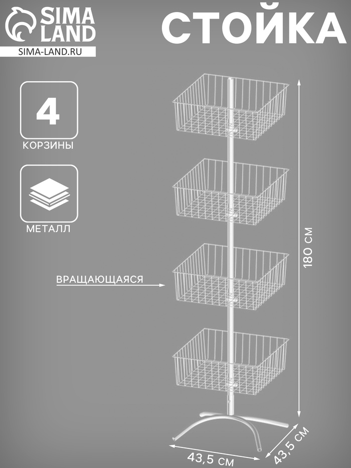 Стойка вращающаяся с 4 квадратными корзинами, напольная, 43.5×43.5×180 см, цвет белый