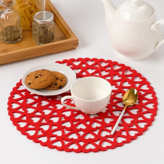 Салфетка декоративная Доляна"Сердечки" цвет красный,d 30 см, 100% п/э, фетр