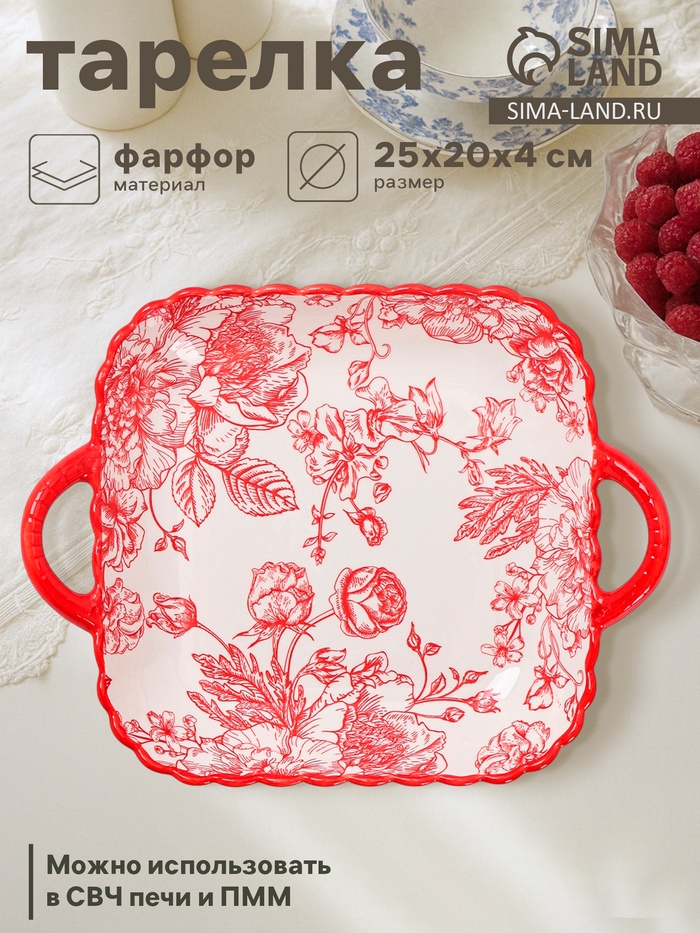 Тарелка с ручками Botanica, 25×20×4 см, фарфор, белая, красная