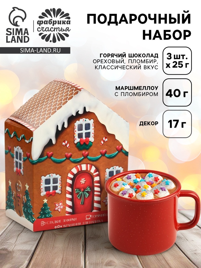 Подарочный новогодний набор «Пряничный домик»: горячий шоколад 3 шт. × 25 г, маршмеллоу 40 г, декор 17 г