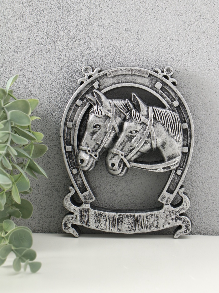 Панно "Подккова с лошадками" 12х15 см, сталь с посеребрением
