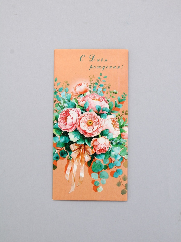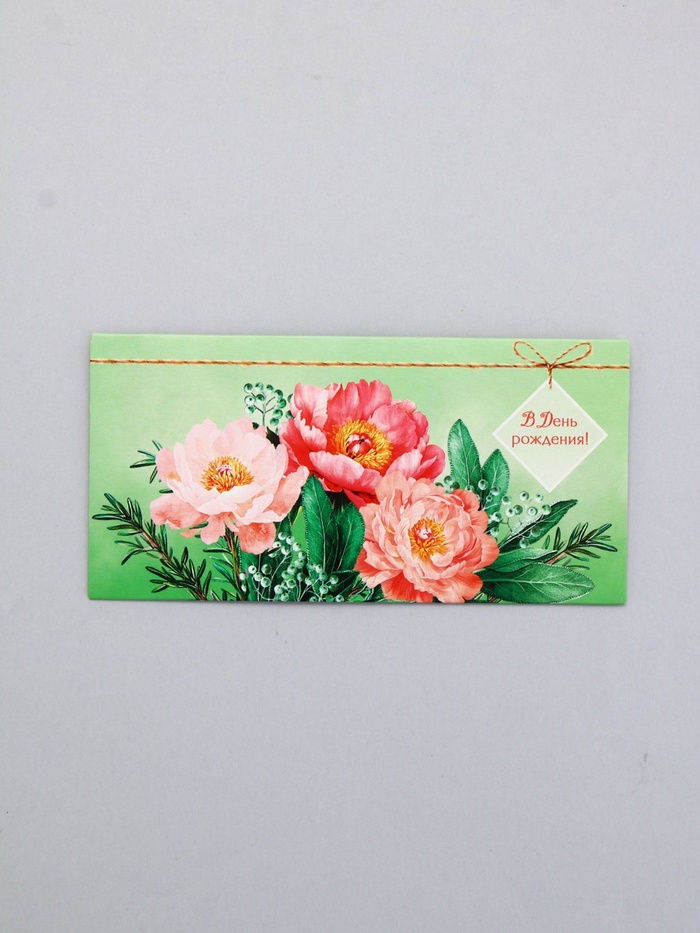 Конверт для денег «В День Рождения!», пионы, 16,5 х 8 см