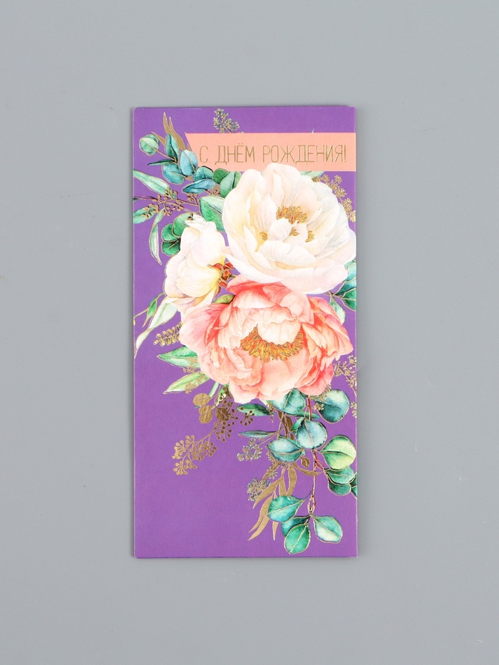 Конверт для денег «С днём рождения», цветы на сиреневом, 16,5 х 8 см