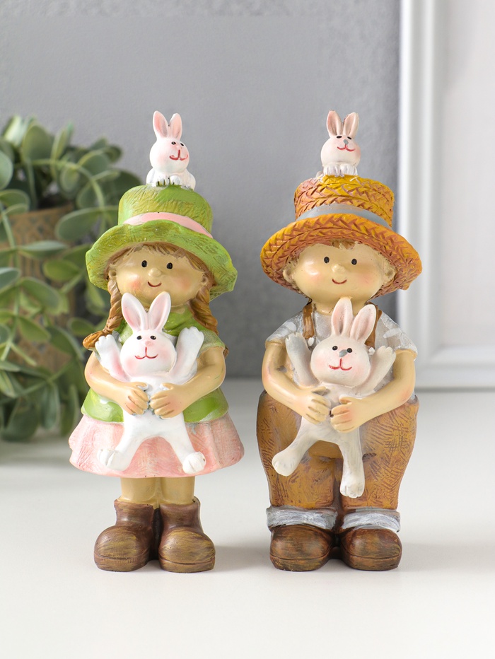Сувенир полистоун "Малыши в соломенных шляпках, с зайчатами" набор 2 шт 5,5х6х14 см