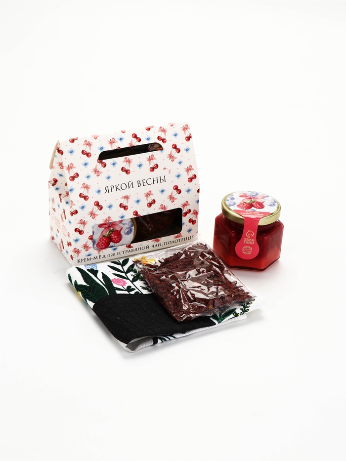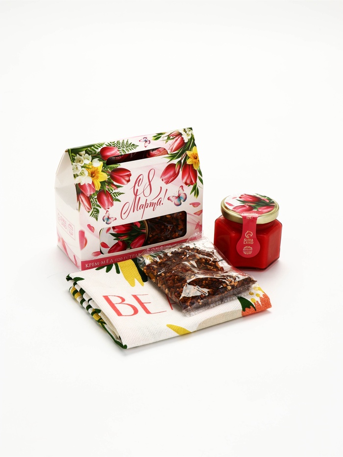 Набор с крем-мёдом 120, чаем и полотенцем в коробке "С 8 марта"
