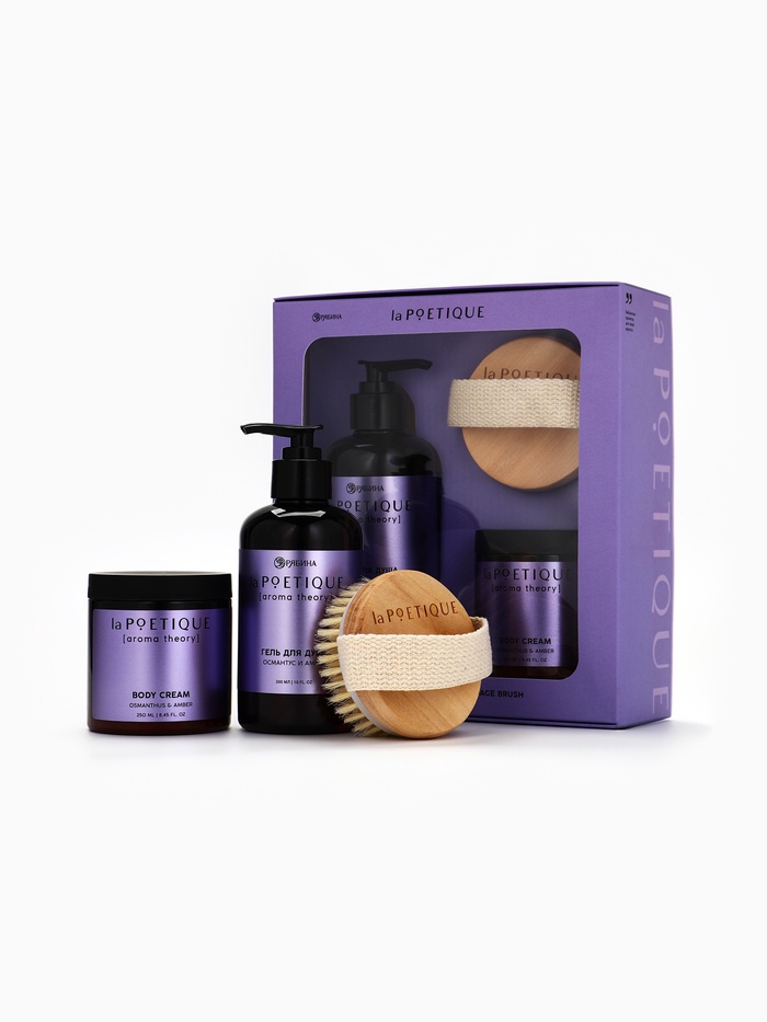 Подарочный набор: гель для душа 300 мл, крем для тела 250 мл и массажка, османтус и амбра, POETIQUE