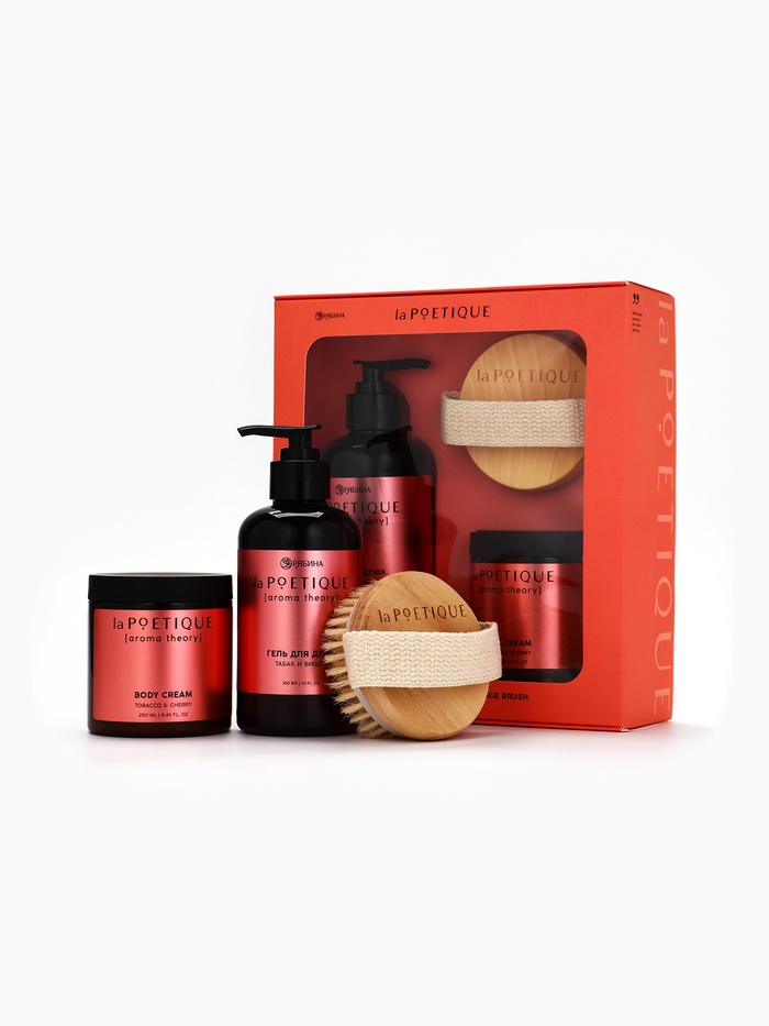 Подарочный набор: гель для душа 300 мл, крем для тела 250 мл и массажка, вишня и табак, POETIQUE