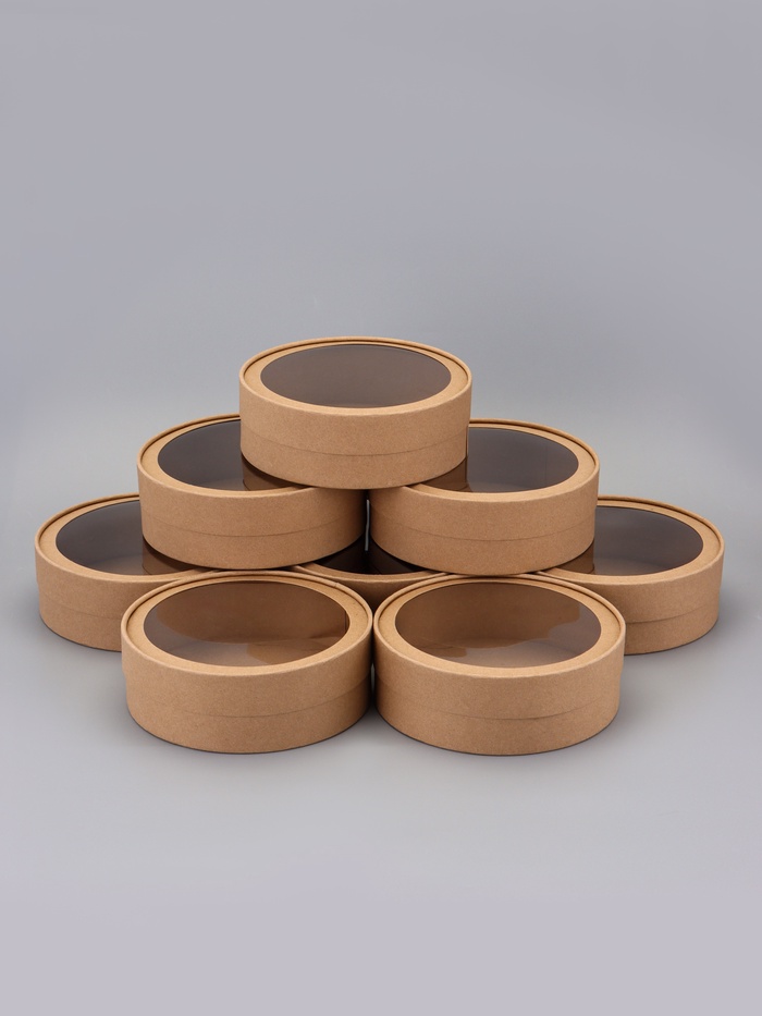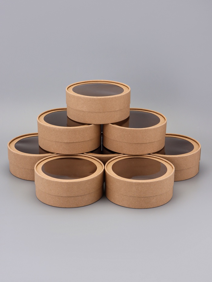 Набор круглых подарочных коробок, завальцованные с окном, крафт, набор 8 шт., 15×6 см