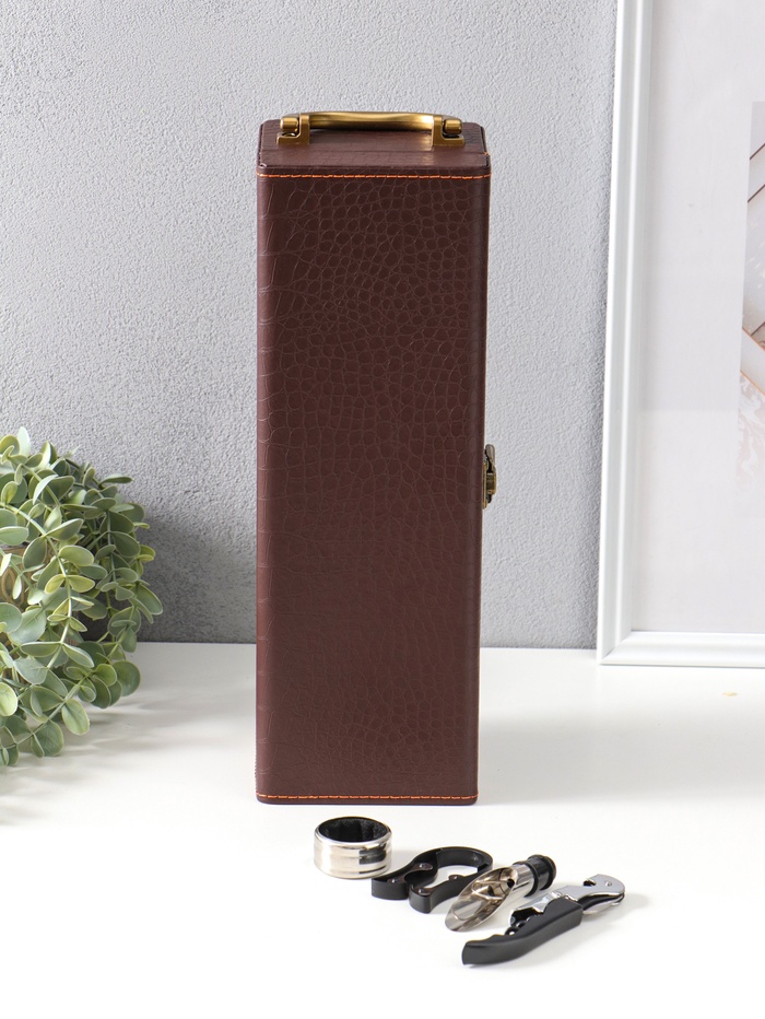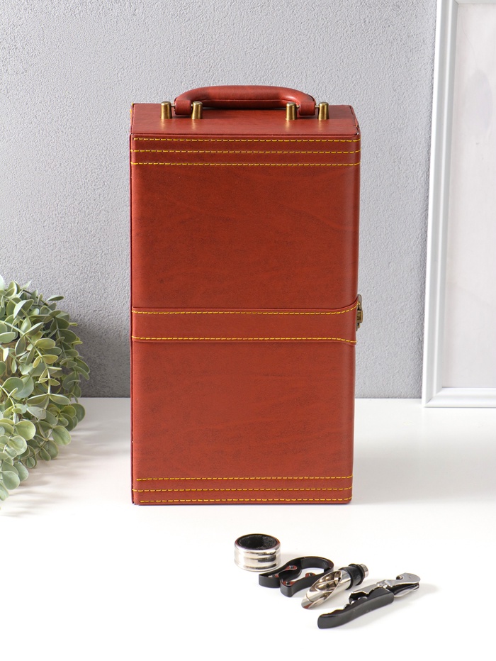 Шкатулка подарочная под 2 бутылки «Гладкая кожа» и набор 4 предмета, коричневая, 34.5×20×12 см