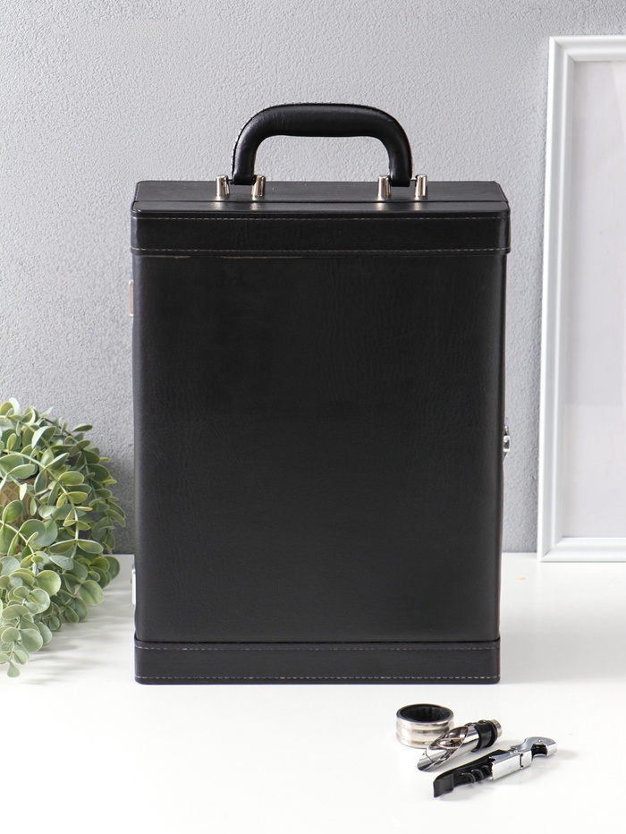Шкатулка подарочная под 2 бутылки «Гладкая кожа» и набор 3 предмета, чёрная, 35×26.5×12 см