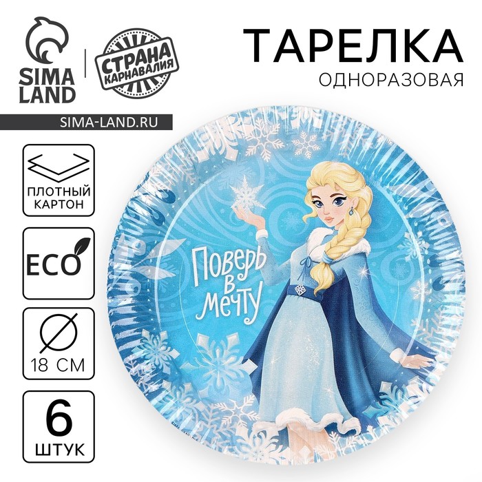 Тарелка одноразовая бумажная "Холодная принцесса" 18 см, набор 6 штук