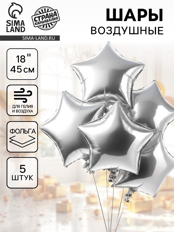 Воздушный шар фольгированный 18" звезда, цвет серебро, набор 5 штук