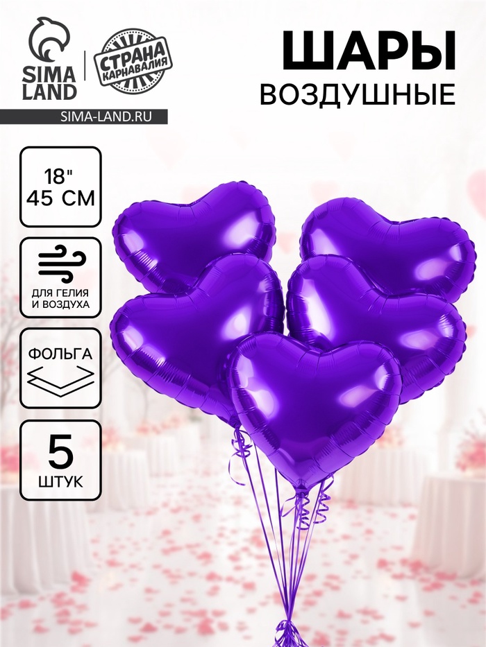 Воздушный шар фольгированный 18" «Сердце», фиолетовое, набор 5 шт.