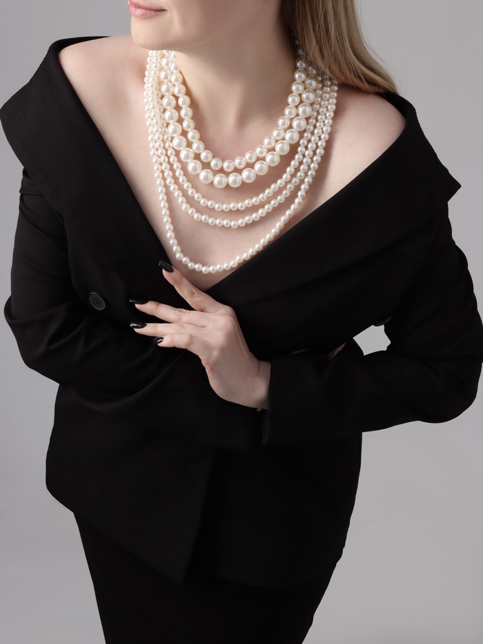 Колье «Жемчуг» сердце, шар №8, белое в серебре, L= 45 см