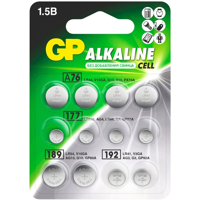 Батарейка алкалиновая GP, ACM01-12BL(А76 по 4 шт.;164,186,189 192-по 2 шт.); 1.5В,12 шт.