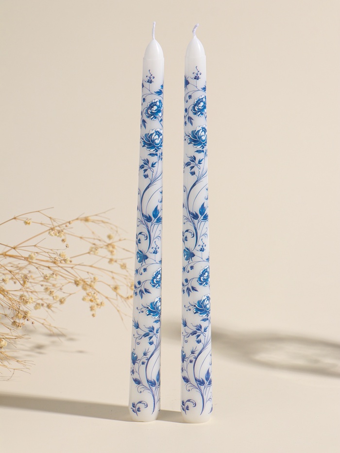 Набор свечей античных, 2.2×25 см, 2 шт. «Пионы», сине-белые, 8×28×2.3 см