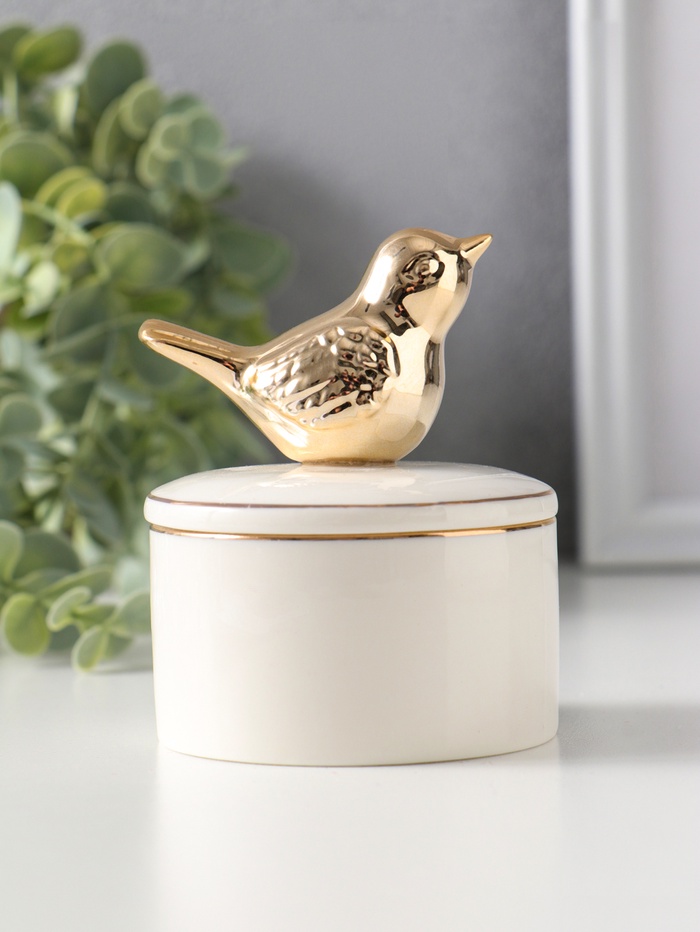 Шкатулка для украшений «Золотой воробушек», керамика, белый рельеф, 11×8.2×8.2 см