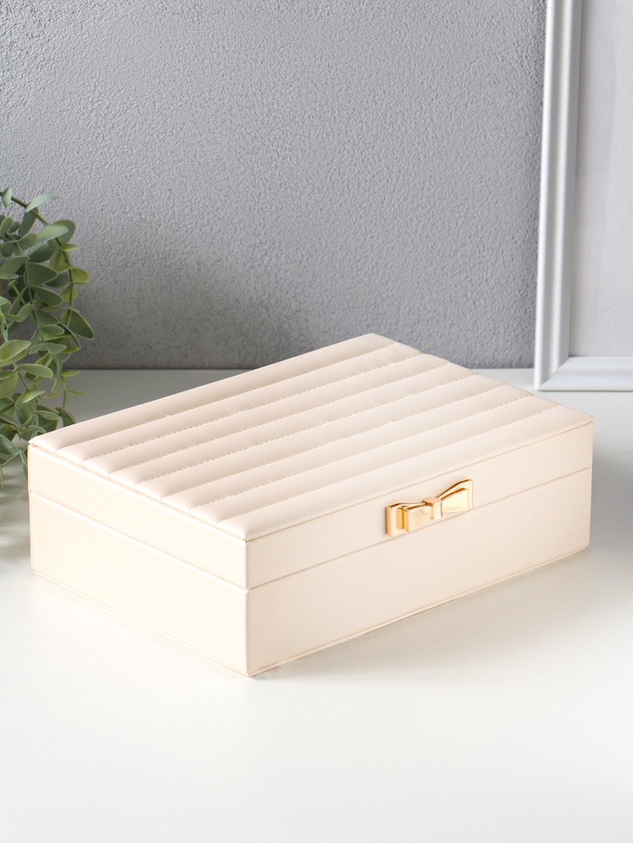Шкатулка кожзам для украшений "Стёганная. Полоски. Бант" молочный 17х24х7 см