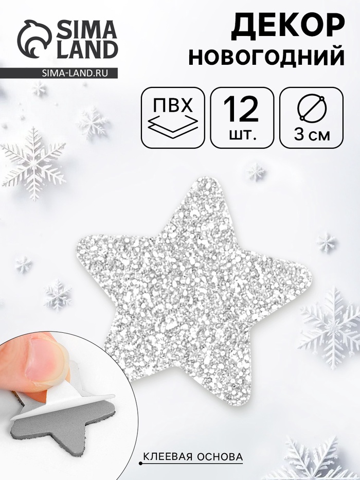 Декор "Звезды" на клеевой основе, серебро 3 см (набор 12 шт)